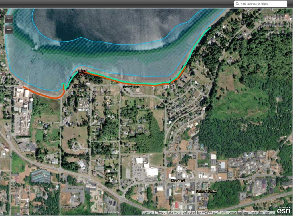 Just looks like a beach, doesn’t it? But there are good beaches for little fish, and not-so-good ones. The idea is make the beach useful for safety and spawning for little several kinds of small forage fish. These are small, schooling fish that serve as a vital food source for larger predators. Eaten by salmon, then the salmon are caught by orca – because orca are starving. This map below shows the three forage fish species, blue, green and red. The beach is right in the middle of the map.