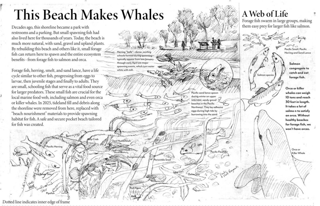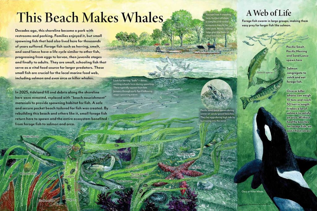 The first wayside panel of several more to come, this is going on Freeland Beach, a county shoreside park that has just rebuilt their beach to accommodate forage fish. Sure, people get to be here as well, but this is yet another effort to save endangered Orca whales in Puget Sound. Freeland is on Whidbey Island, just east of my studio here in Port Townsend, Washington.