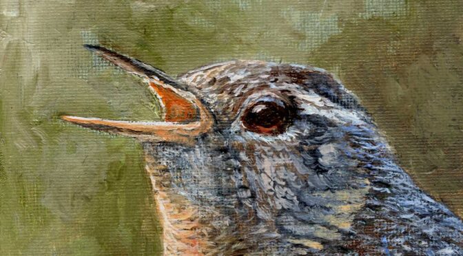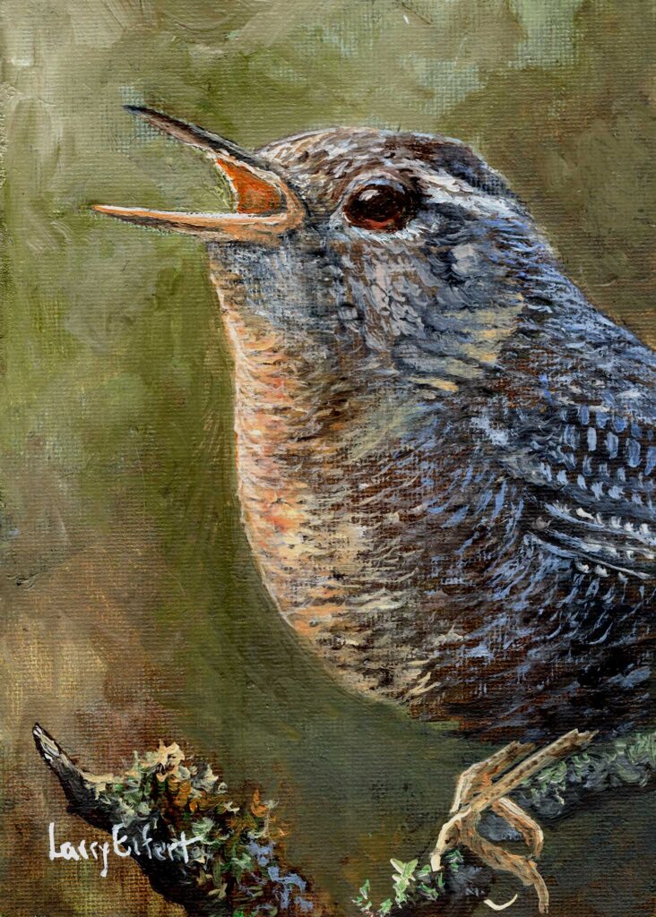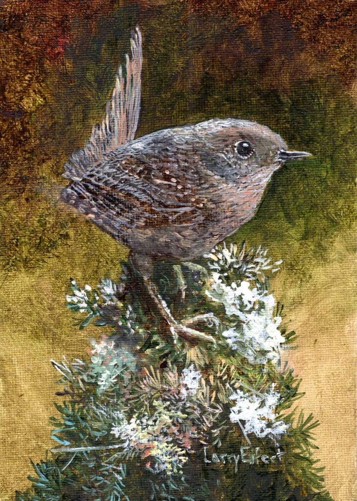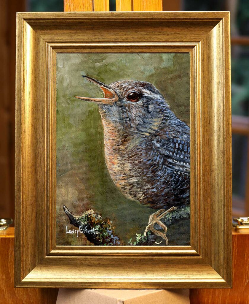 Pacific Wren is a new oil on canvas, taken from life, this little guy was singing it’s heart out right here in our forest. It’s frame is 7″x9″.