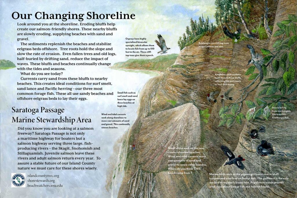 I just finished wayside panel #2 for Island County’s Freeland Beach Park. It matches the first panel I posted a couple of weeks ago and replaces a worn-out 25 yr old panel. It’s about how Puget Sound bluffs continually make beaches, keep them healthy and support an entire ecosystem. Fun making this one up. This panel will outlive me, I’m sure, because it’ll be printed on aluminum.